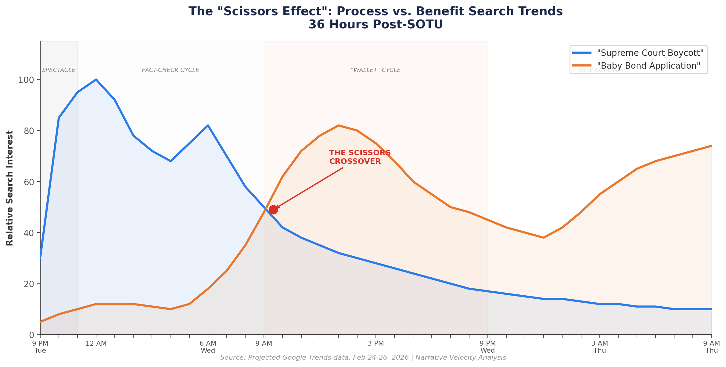 Hours 24-36 (Wednesday night into Thursday morning): The New Normal. The SCOTUS boycott story faded from cable rotation. Baby Bonds remained the top local story in swing states. The narrative settled into two parallel tracks that showed no signs of converging: "The Boycott SOTU" for political elites and "The Baby Bond Launch" for everyone else.